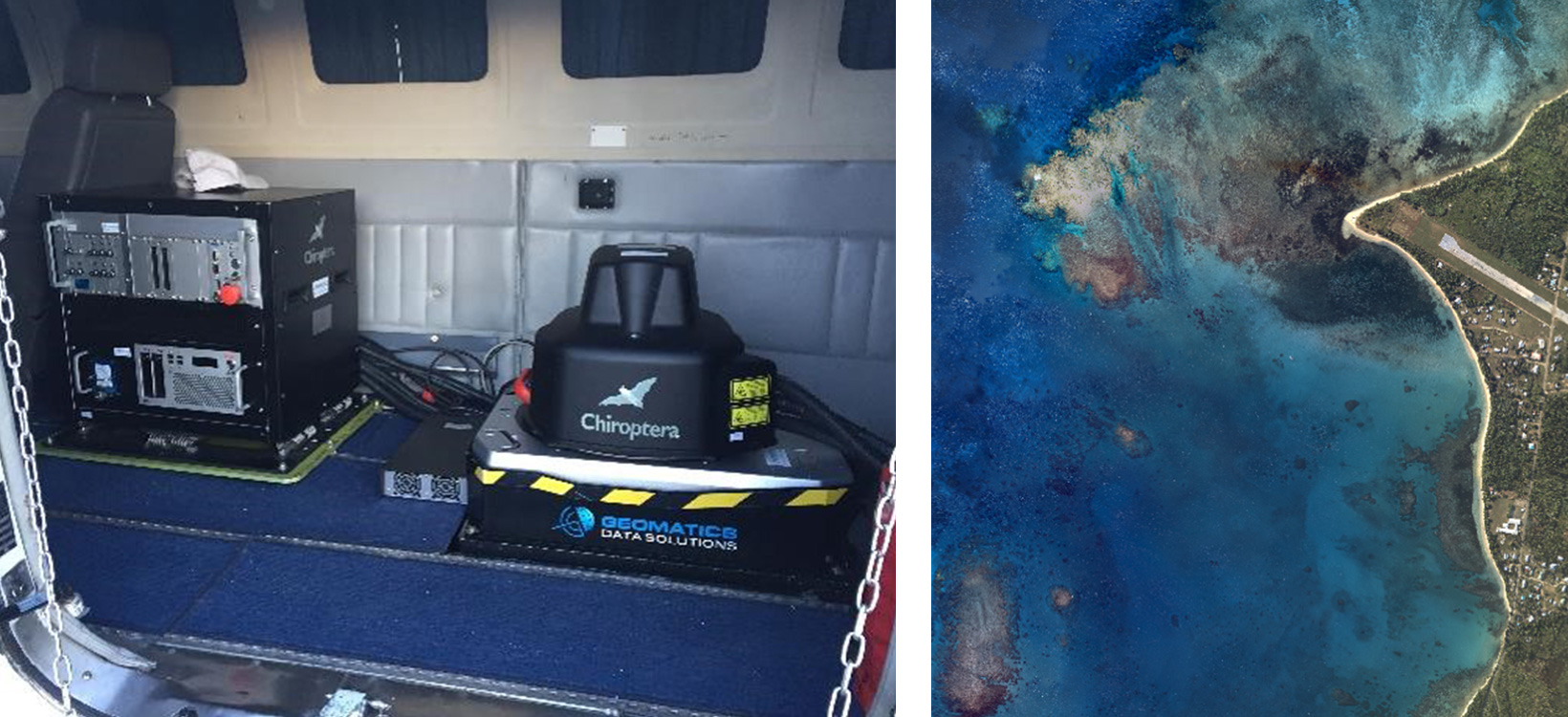 The Chiroptera 4X was installed in a Cessna 441 to acquire data for Tonga and Niue, including Beveridge Reef, covering approximately a 633-square-kilometre area. Geomatics Data Solutions experts collected both high-resolution bathymetric and topographic data on- and offshore and compared the results of the Chiroptera 4X to SDB.