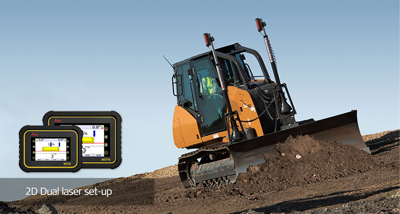 The Leica iCON grade iGD2 solution provides automatic control of both slope and elevation. Laser receivers are mounted on the dozer and used together with a rotating laser. A single laser indicates height. Adding an extra mast and laser sensor allows you to work independently of the slope direction.