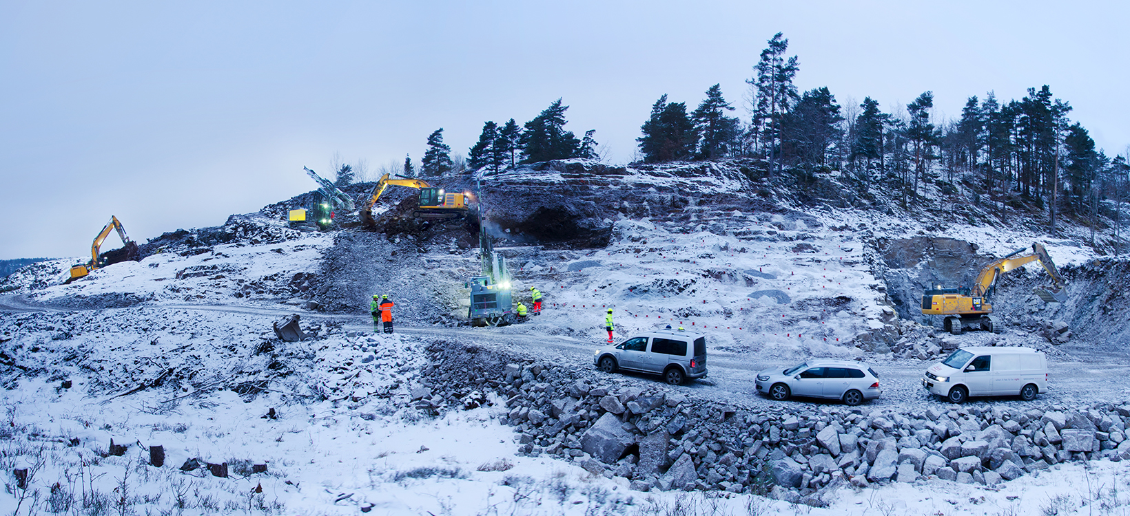 On the job site at Stathelle, excavators dig down to the rocky surface. Following the digitally defined drilling pattern, drill rigs are then used to drill holes into the rock for blasting.