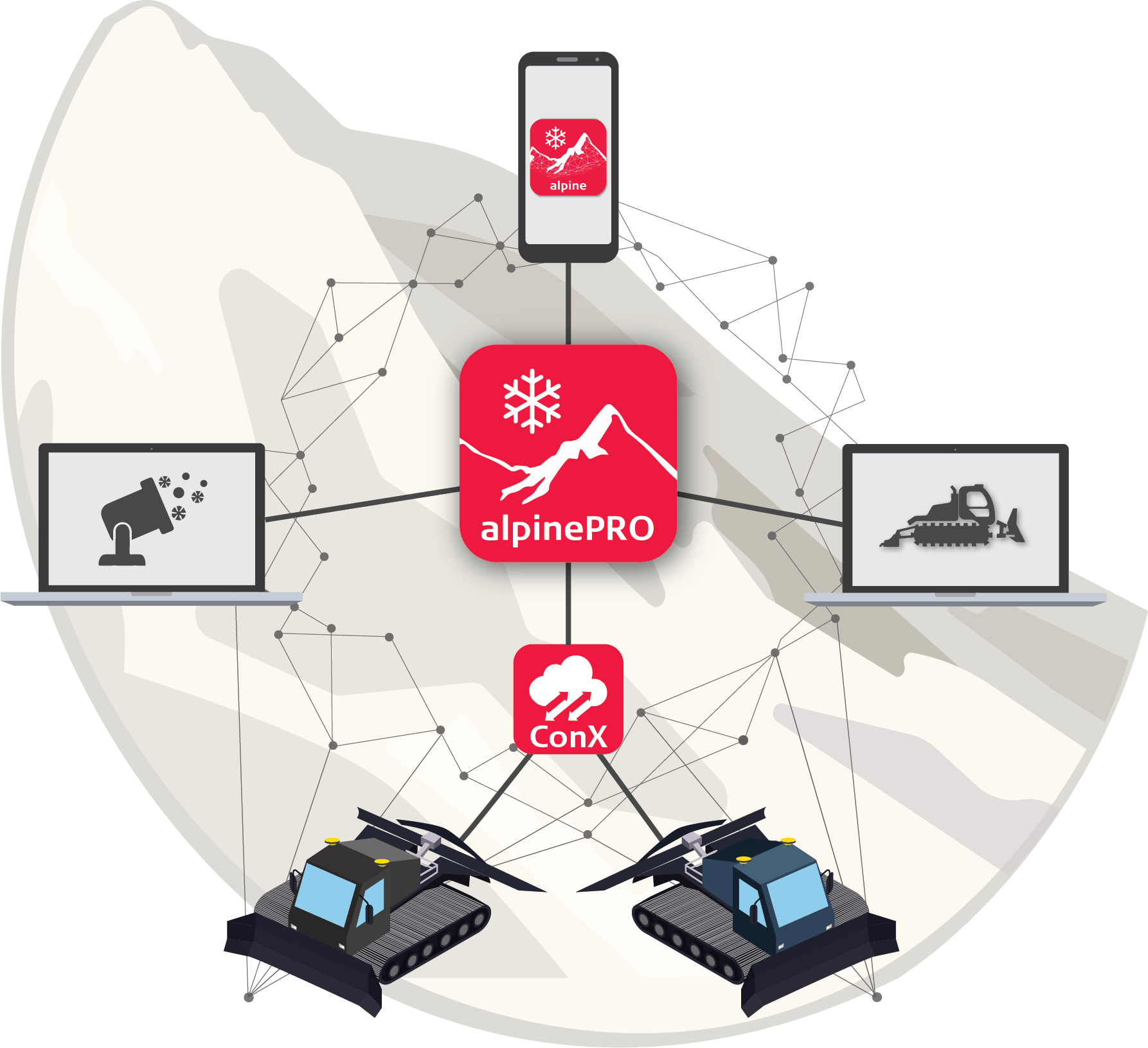 The Leica alpinePRO software is a key component of a comprehensive snow management solution, working seamlessly with other systems for optimal results. It integrates with Leica iCON alpine to guide snow groomer operators using 3D models, and with Leica ConX to sync surface logging data and monitor work progress.