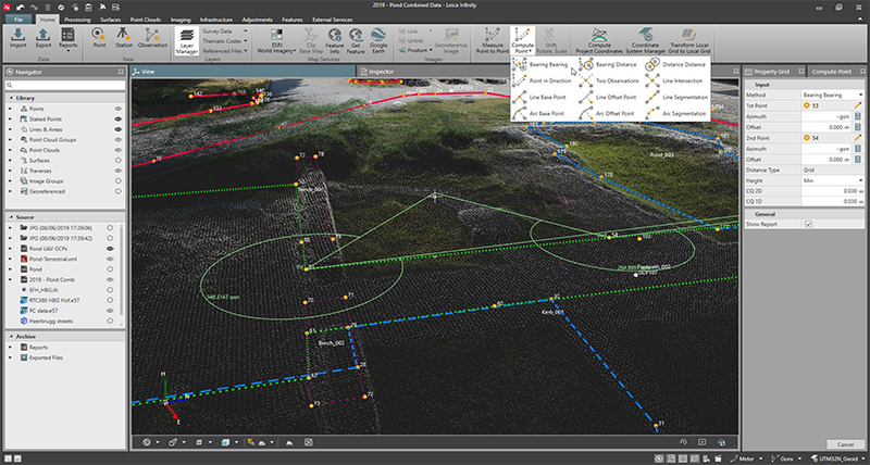 Infinity bietet eine breite Palette an Werkzeugen für die Berechnung der Koordinatengeometrie (COGO), damit Sie schnell und unkompliziert anhand von gemessenen Daten oder Entwurfsdaten zusätzliche Positionsdaten berechnen können.