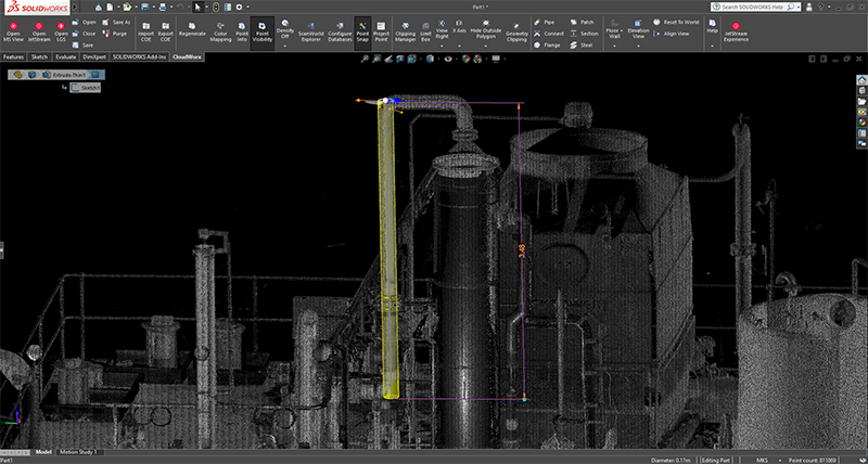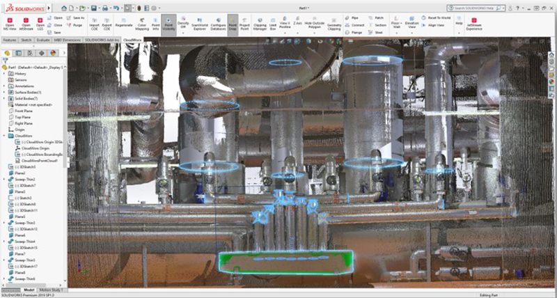 Leica CloudWorx für SOLIDWORKS bietet Benutzern eine Möglichkeit, mit der Modellierung oder Linienführung anhand von in Leica Cyclone oder Leica JetStream gespeicherten Punktwolken direkt in SOLIDWORKS zu beginnen.