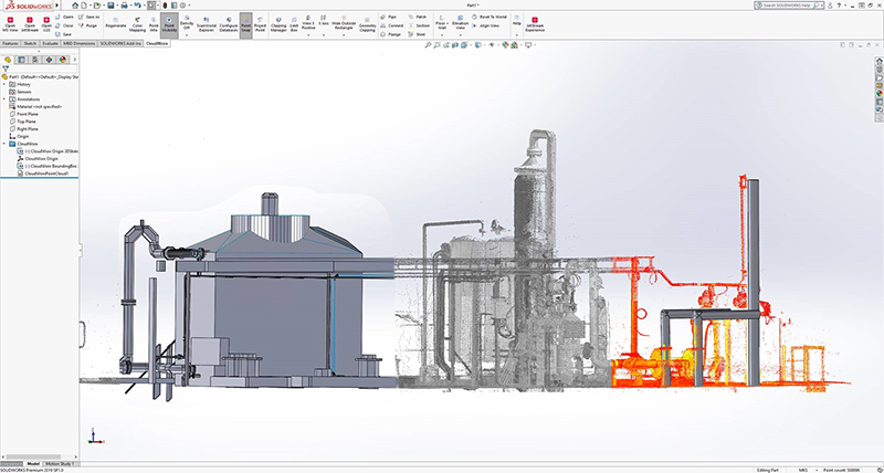 CloudWorx für SOLIDWORKS ist die leistungsfähigste Punktwolkenlösung für SOLIDWORKS. Von Einzelteilen bis zu ganzen Anlagen mit Milliarden von Punkten – mit CloudWorx können eine ganze Bandbreite an Projekten mühelos bearbeitet werden. So können Entwürfe im Kontext visualisiert, visuelle Kollisionskontrollen durchgeführt und Modelle vom Istzustand mit höchster Genauigkeit erstellt werden.