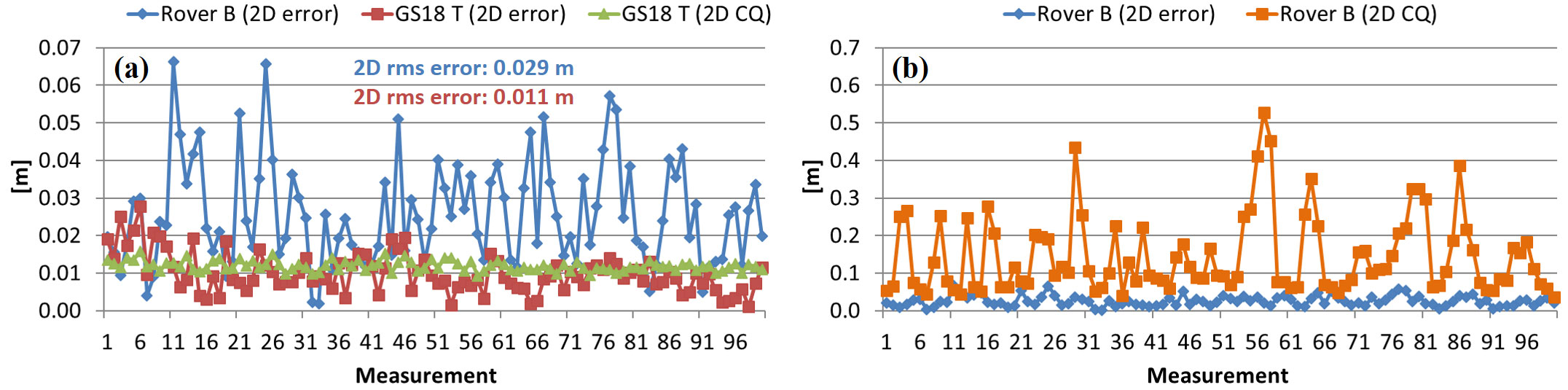 Looking at the rms errors summarised in Table 3, the 2D accuracy of GS18 T is approximately 2 cm better than that of Rover B, whereas the 1D accuracy is at a similar level.