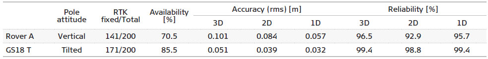 Table 2 - Comparison of the availability, accuracy and reliability of RTK fixed positions between GS18 T and Rover A in a strong multipath environment (pole length: 1.800 m, instantaneous measurement).