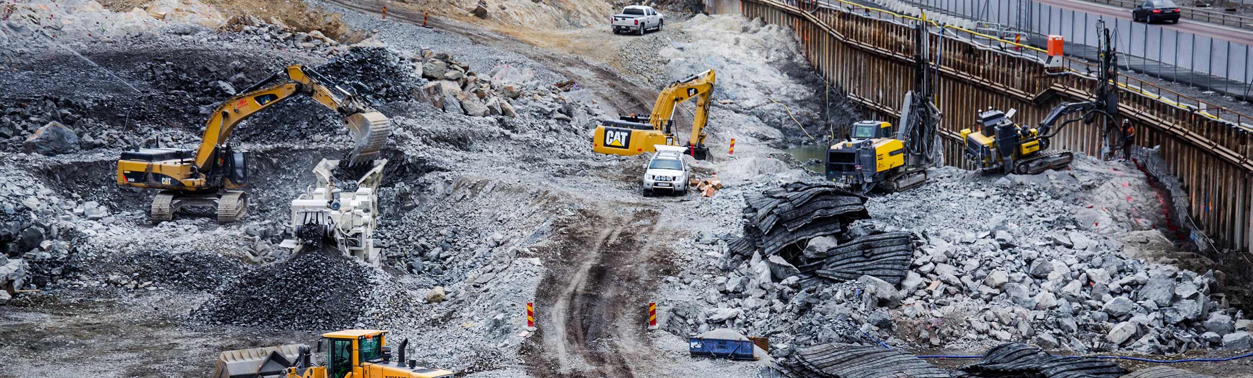 The drill rig follows a digitally-defined pattern to drill holes into the rock for blasting. Traffic is stopped on the two highways that go around the job site, and blasting of the rocky underground is performed every day at either 10 A.M. or 2 P.M. The blasting is done under a carpet of old truck tires that are sewn together to avoid rocks falling onto the two roads.