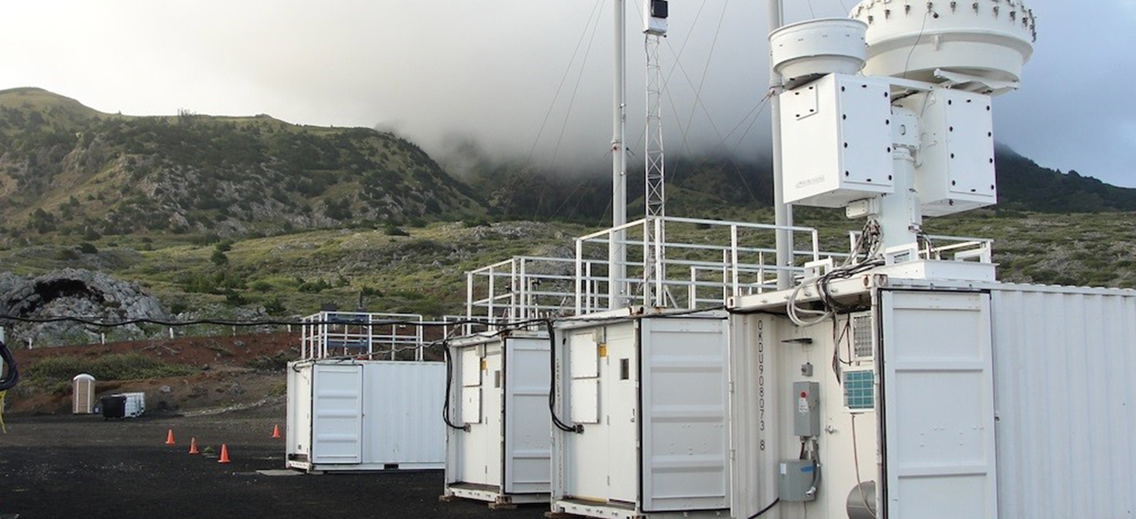 Smoke envelopes the first ARM Mobile Facility during a hazy day on Ascension Island, which is located in the South Atlantic Ocean.
