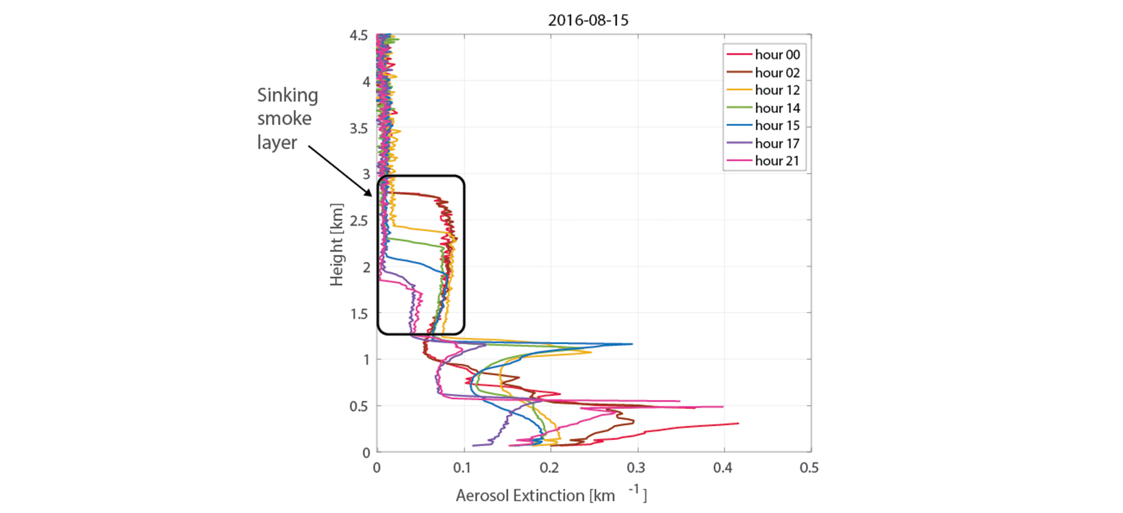 Extinction profiles from one day of MPL observations (2018-08-15) show a sinking smoke layer over 21 hours from approximately 2.8 km at hour 00 to approximately 1.8 km at hour 21.