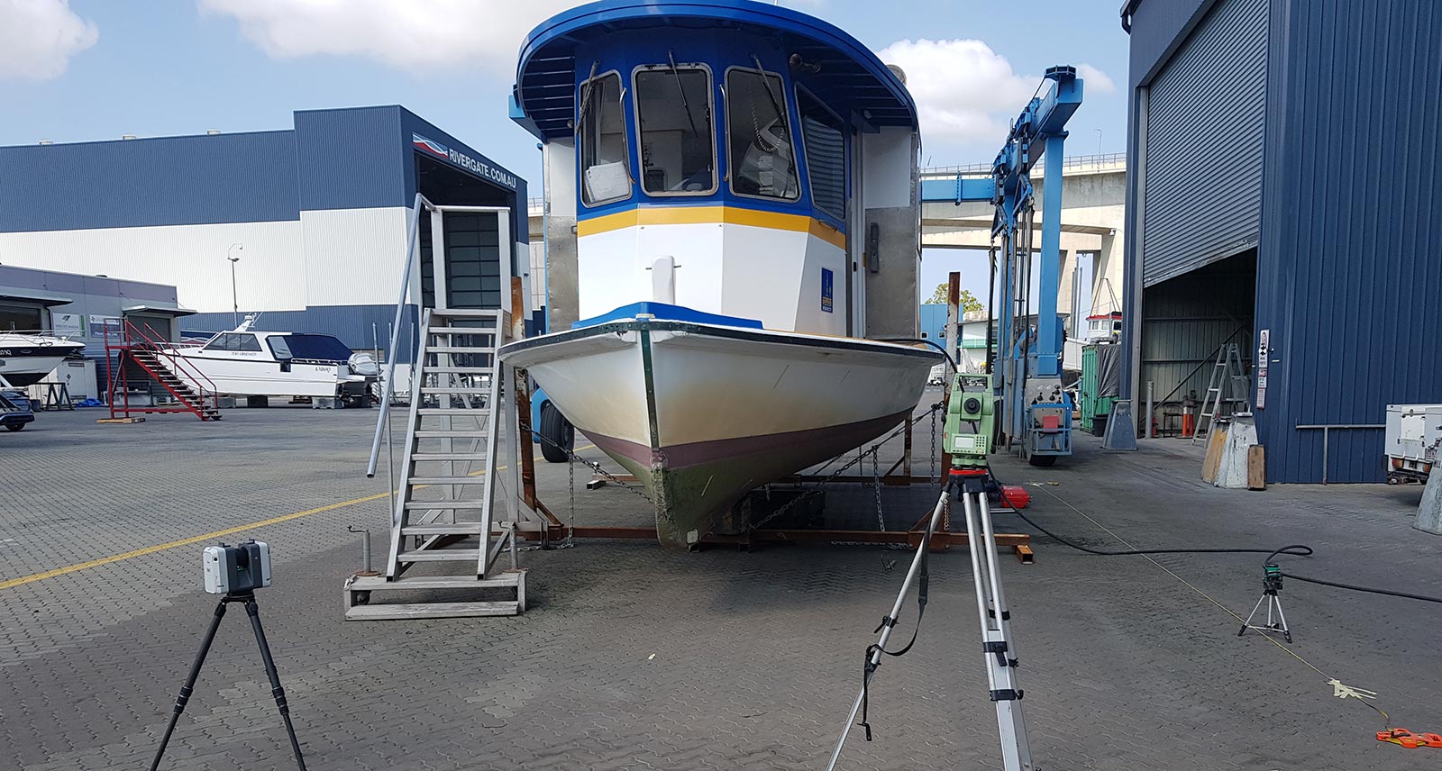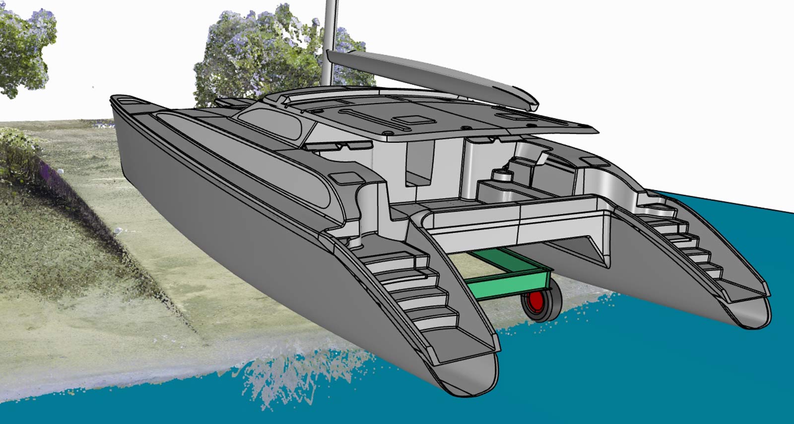 The vessel and the ramp were scanned using the RTC360 LT to simulate the launch of a refitted "Perry 57” catamaran. Blue Marble Marine needed to determine the tide height required to float the vessel off the launching trailer.