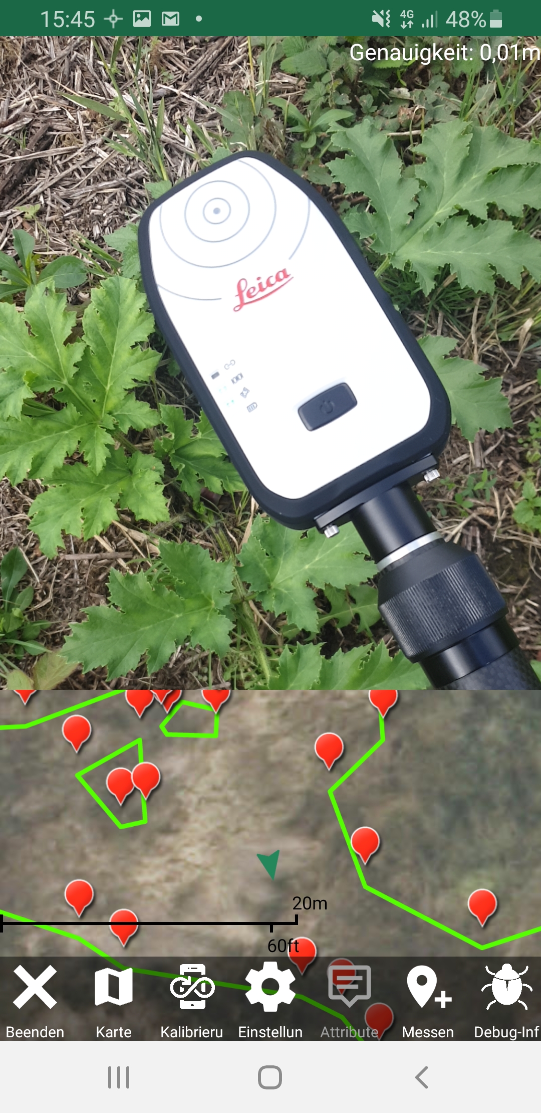 What previously existed on paper can be seen at their fingertips as they walk, including underground objects like pipes and ducts. Besides experiencing data visually, Tiemann & Partner surveyors can maintain or measure with centimetre accuracy any points, lines or areas. With the antenna and app solution, crew members can control, add attributes or record in 3D AR or in a 2D map.