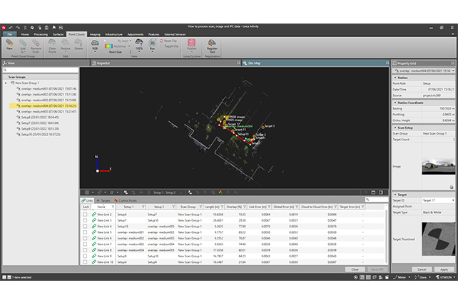 With Leica Infinity 4.0, you benefit from import and registration scan setups along with common registration methods. Supporting the direct import of terrestrial laser scanning data from Leica BLK360 and Leica RTC360 3D laser scanners, Infinity allows up to 100 scan setups per project. This ultimately helps the registration process, in which different scans are matched and aligned with one another to create a single data set or point cloud.