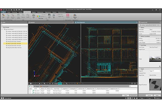 During registration all scans from a project are combined and aligned to form a single, optimised point cloud called the unified point cloud (UPC). Once the scan data is georeferenced and the UPC is stored, it can be visualised along with point clouds from UAV and Leica GS18 I image data, as well as any other point cloud data, measurements or linework imported into the project.