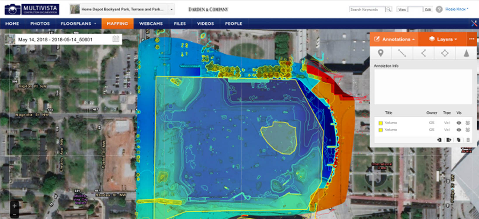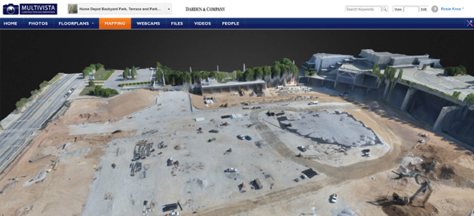 Darden & Company used Multivista to document the project site using UAV mapping. Once a week, Multivista pilots would fly UAVs over the site, collecting visual data. That data was processed through an advanced photogrammetry engine to produce a map that could be accessed from within the Multivista platform. Project stakeholders were able to annotate the map, use it to measure distance, volume, area and elevation, and export the captured data to create 3D models.