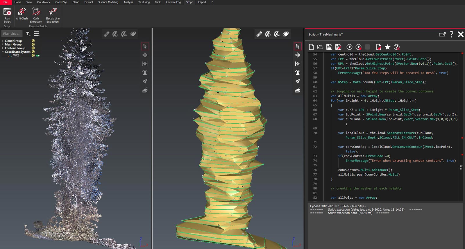 One key technology transferred from 3DReshaper to Cyclone 3DR is Scripting. This enables any user to customise simple solutions to complex problems through, for instance, automation of high frequency tasks, creation of customised workflows and to create new data processing algorithms in order to answer some specific needs which are not covered by the main software itself. One scripting example that demonstrates the power of this functionality is in the automated meshing of an inventory of trees to get the volume of the tree leaves. Quite often the complexity of the various 3D shapes of the trees demands that different algorithms are used. By designing a custom script which calculates the number os trees, tree height, crown area and crown volume, a user can automate the creation of an inventory of all trees within a defined area. This domain-specific workflow is not available in the off-the-shelf version of Cyclone 3DR but can be easily customised from the flexible toolset in Cyclone 3DR to meet the needs of different stakeholders, incorporating expected regional variations along the way.