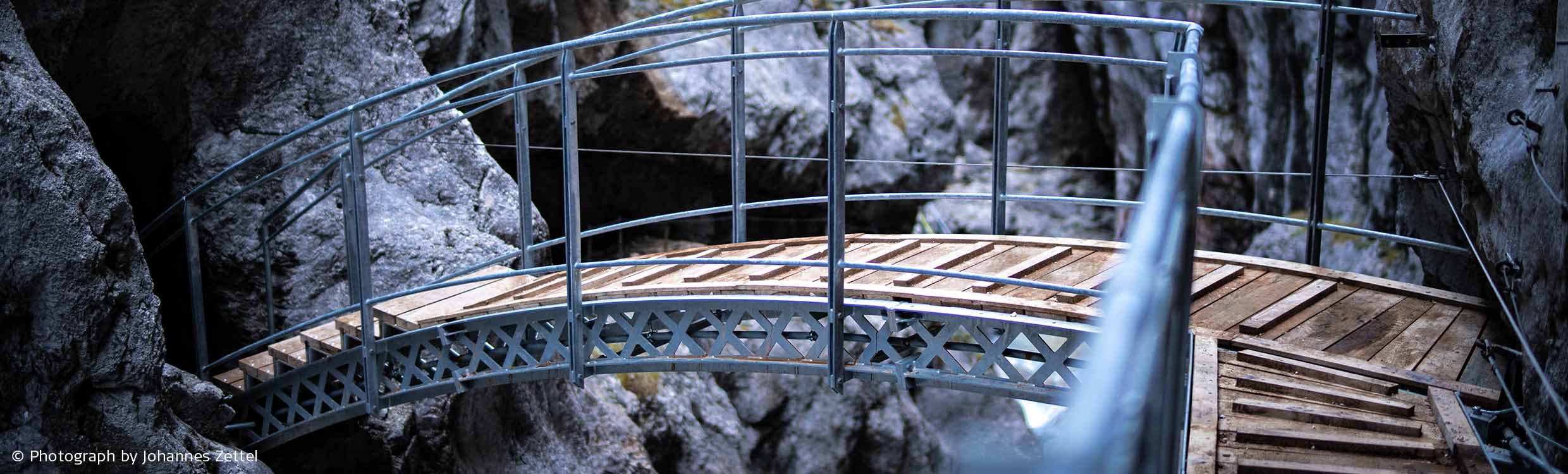 The Höllentalklamm - in English “Hell's Gorge” - near Garmisch-Partenkirchen is a unique natural spectacle 1,000m high in the German Alps. It’s part of the hiking route to the Zugspitze peak, a connection only made possible due to a historic bridge across the gorge, built in 1905. Due to its age and deterioration, the bridge and several footbridges had to be replaced in 2020. The local members of the German Alpine Association (DAV) raised money for the 250,000-euro project and found two crucial corporate sponsors – the transport infrastructure specialists ZÜBLIN / STRABAG and Thyssen-Krupp.