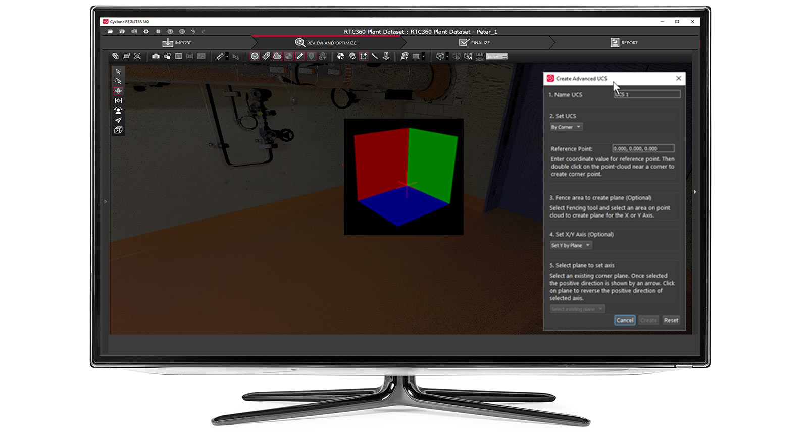 Cyclone REGISTER 360 -ratkaisussa UCS:ää voidaan myös käyttää asetukseen tai pakettiin. Z-tason asettaminen X- tai Y-akselin asettamisen ohella tarjoaa käyttäjille mahdollisuuden käyttää haluttua UCS:ää useimmissa tapauksissa. Z-tason asettamista tuetaan muodostamalla maataso ja asettamalla sitten Z-akseli tai "Ylös-suunta" asetuksia kohti. X- tai Y-akselit voidaan asettaa luomalla taso seinälle tai käyttämällä kulmatason luontiohjelmaa kuvan 3 mukaisesti.