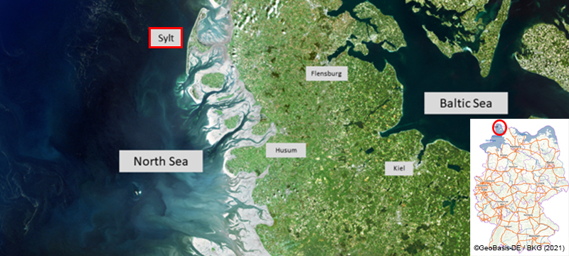 The German island of Sylt lies on the outer edge of the Schleswig-Holstein Wadden Sea, between 9–16 km off the mainland. While other islands in the North Sea are surrounded by extensive intertidal sand and mud flats ─ called wadden ─ that protect the coastlines, the west coast of Sylt is completely unprotected and exposed to the forces of the water. Harsh weather conditions such as strong currents from tidal ebb and flow, frequent sea storms, and waves up to 10 metres (m) high continuously reshape the island, despite attempts to reduce erosion along its sandy beaches. Since the 1980’s, preservation efforts have focused on pumping sand back onto the beaches every year, rather than constructing unnatural concrete structures.