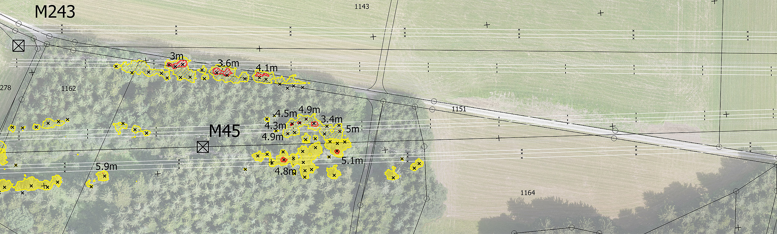 In the further process, the calculated point cloud is given to the Swiss company picterra GmbH. The software determines the distances between vegetation and power lines. Those points are marked in the point cloud at which the minimum distance is determined. A situation plan is derived from the model that shows the hazards as well as the parcel boundaries and numbers, roads, paths, lines and mast designations. On the basis of the situation plan, the coordinates of the hazard points can be clearly located.