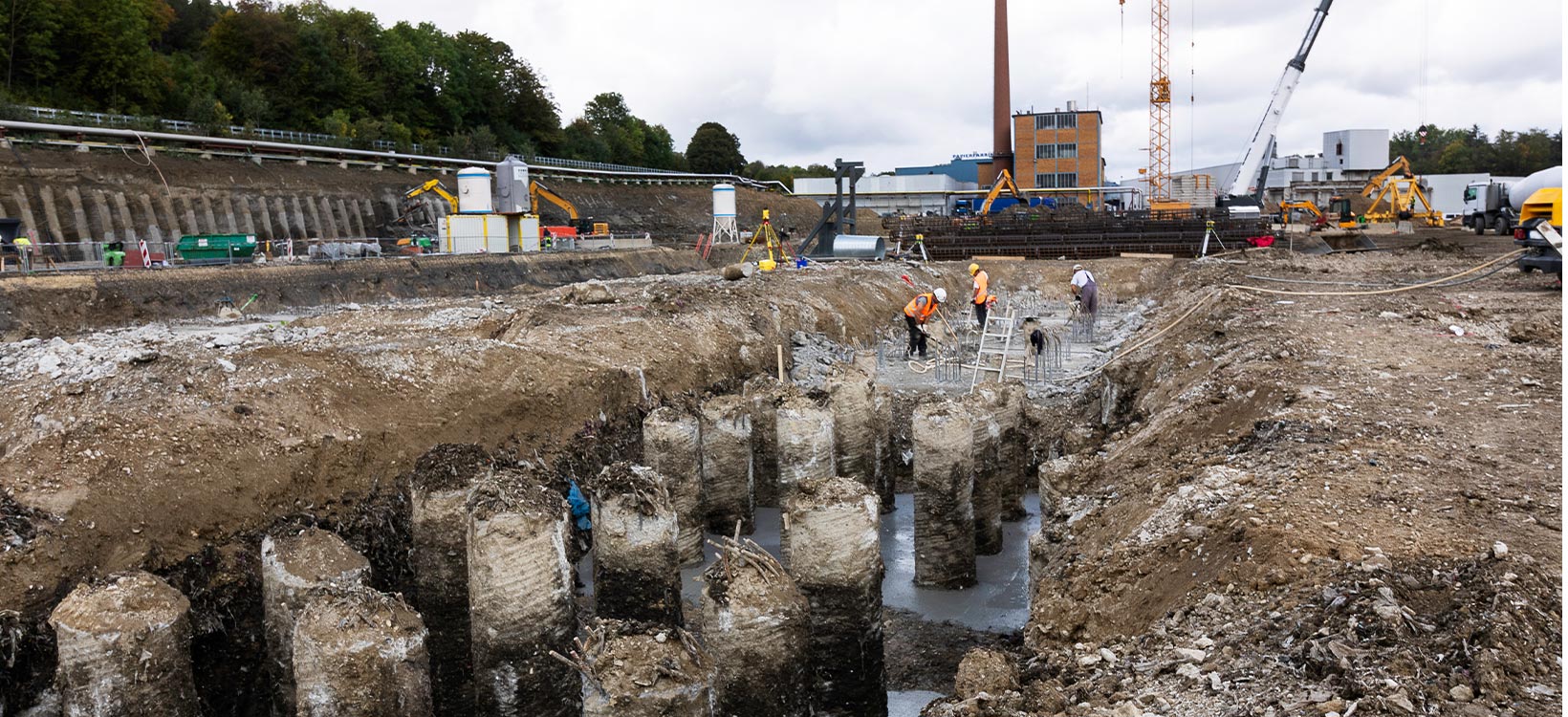 In the small village of Aalen in the south-west of Germany, Palm Paper Factory GmbH is building a new paper factory on sanded ground. The project will be finished in 2022 and will contain heavy paper machines in a large building complex. Therefore, the foundation must be stabilised with concrete piles cast in the underground.