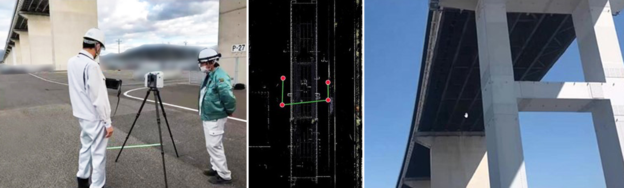 「これまで、メジャーテープを使って現場で測っていた危険な寸法計測は、室内でのパソコン作業に代わり、とても安全になりました。桁がカーブしている箇所をメジャーテープで測るとブレが生じて精度が悪いこともありましたが、点群データによる計測では正確です」と作業を担当する土木部の吉村涼太氏は語る。