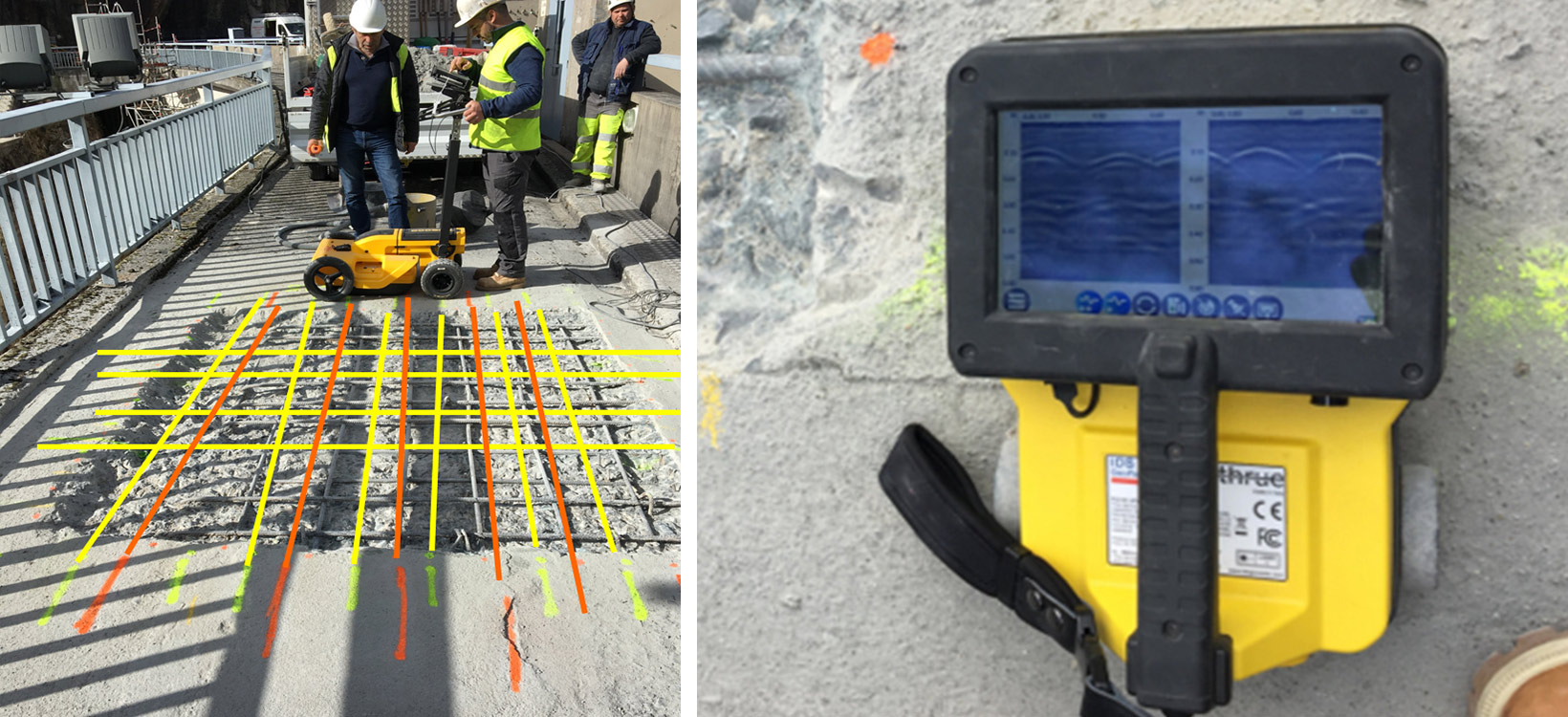 Unless we possess Superman's wondrous vision, GPR is the most reliable tool for effectively locating underground utilities. Accurate scanning and real-time analysis of the dam’s upper apron enabled the team to safely locate and drill the 80-cm-deep holes avoiding the rebars crossing at different levels to perform the maintenance work needed.