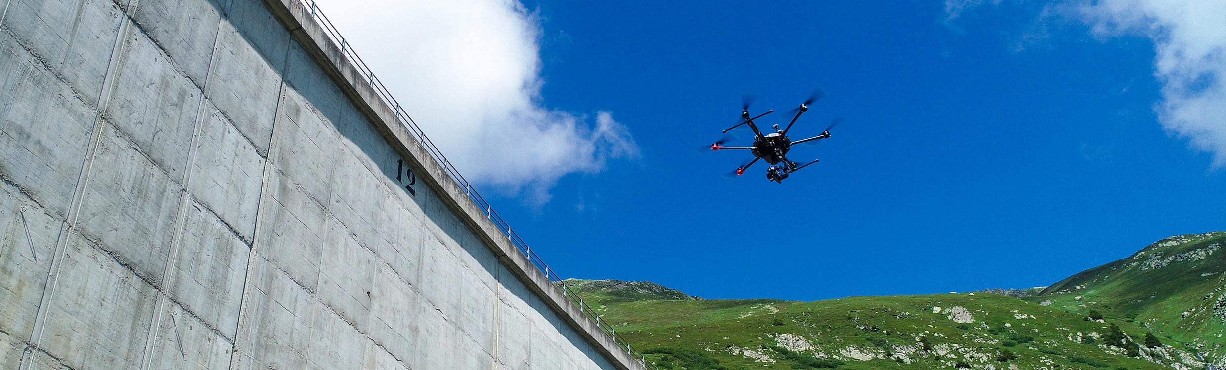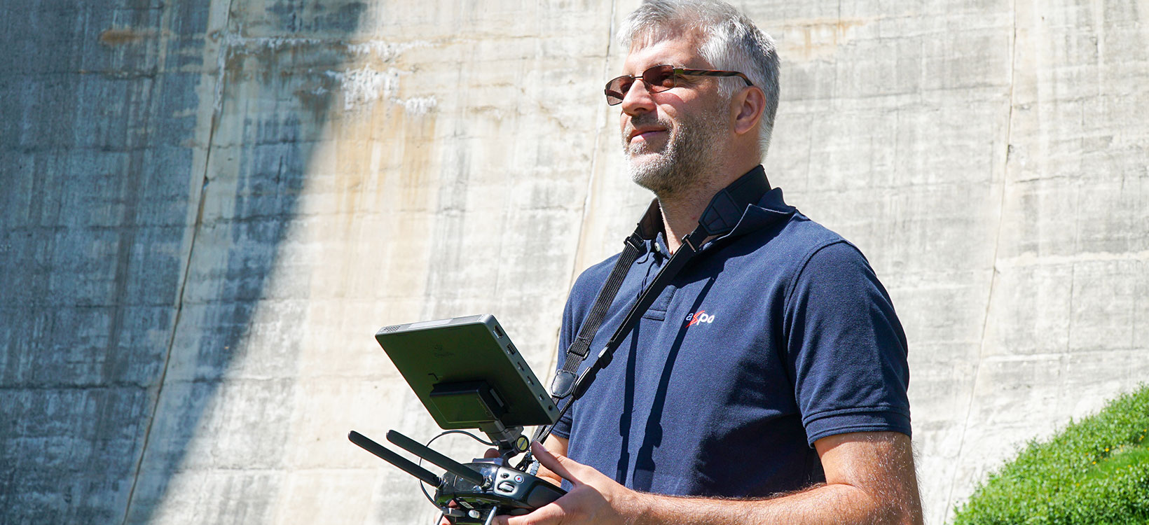 Every dam Axpo operates is planned to have a full UAV inspection every five years using the Aibot. The inspection of a large dam takes two to three days and approximately 10 hours of total flight time. During the flight, the Aibot takes automatic images every two seconds, enabling the pilot to focus just on flying the copter at a constant height and distance close to the wall. The inspection is a two-person job: one operates the UAV with a focus on the flying position, speed and height, while the other person observes the surroundings, focusing on the quality and overlap of the photos taken as well as the status of the batteries.