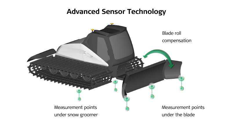 Driepuntsmeting onder het mes vermindert het risico op aanvaringen met het terrein en biedt precisie bij het werken met een gekanteld mes. Drie meetplaatsen zorgen voor een preciezere bepaling van de mespositie, volgens het ontwerpmodel. De dubbele-hellingtechnologie zorgt voor mesrolcompensatie, wat de nauwkeurigheid van de sneeuwdieptemeting aanzienlijk verbetert bij het op- en neerrollen van het mes. Mesrolcompensatie is voordelig bij het voorbereiden van pistes en bij het aanleggen van sneeuwparken en wedstrijdbanen.