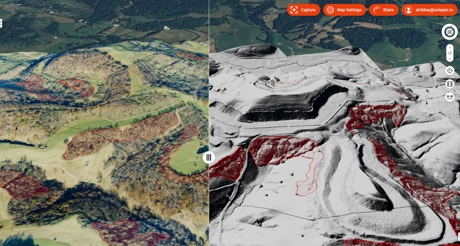 SolSpec Geohazard Analytic is built on machine-learning and trained on 15,000 historic landslides to identify landslide signatures in a digital terrain model even in areas covered by vegetation. Courtesy SolSpec.