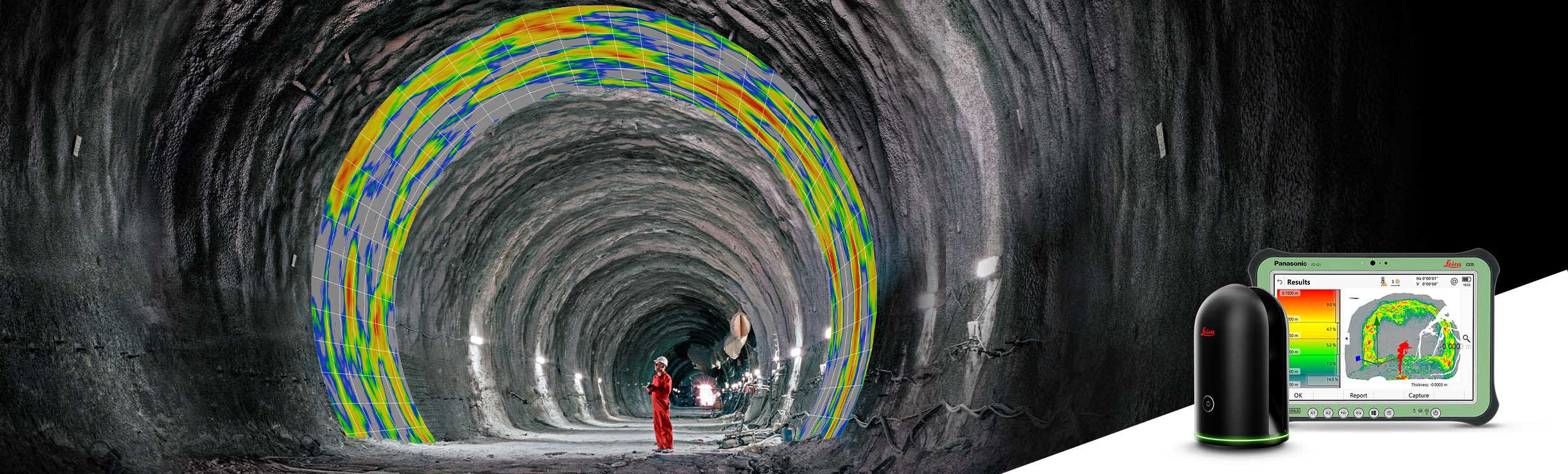 With the Leica RTC360 or Leica BLK360, users position a 3D laser scanner close to the area of interest for the tunnel surface and perform an initial scan. They then spray concrete and, after, perform and transmit a second scan to the Leica CS35 tablet computer running Captivate Inspect Layer application.